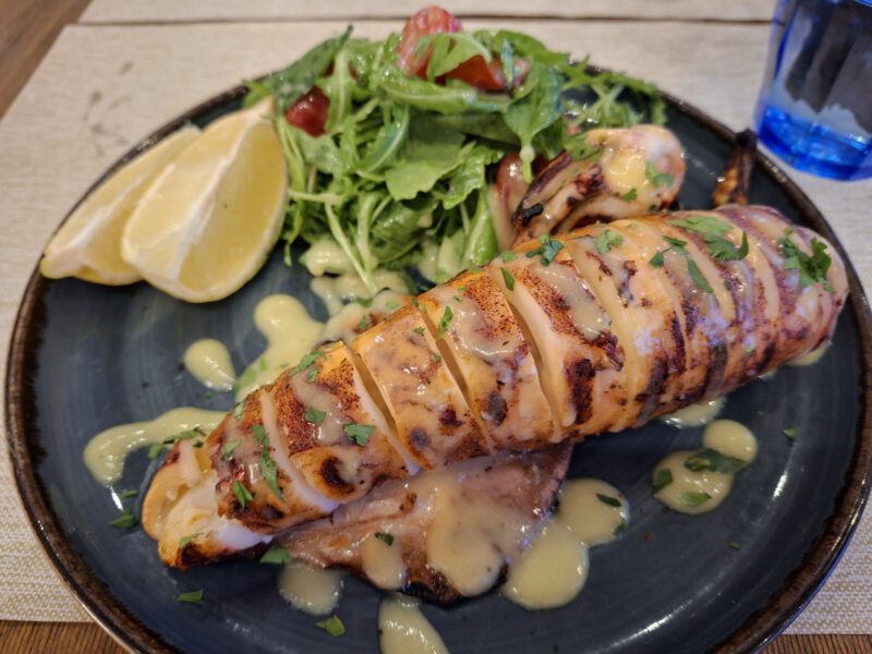 Zuerst war ich etwas skeptisch, aber hinterher muss ich sagen, ich habe selten so einen guten Tintenfisch gegessen, butterzart mit leckerem Salat.