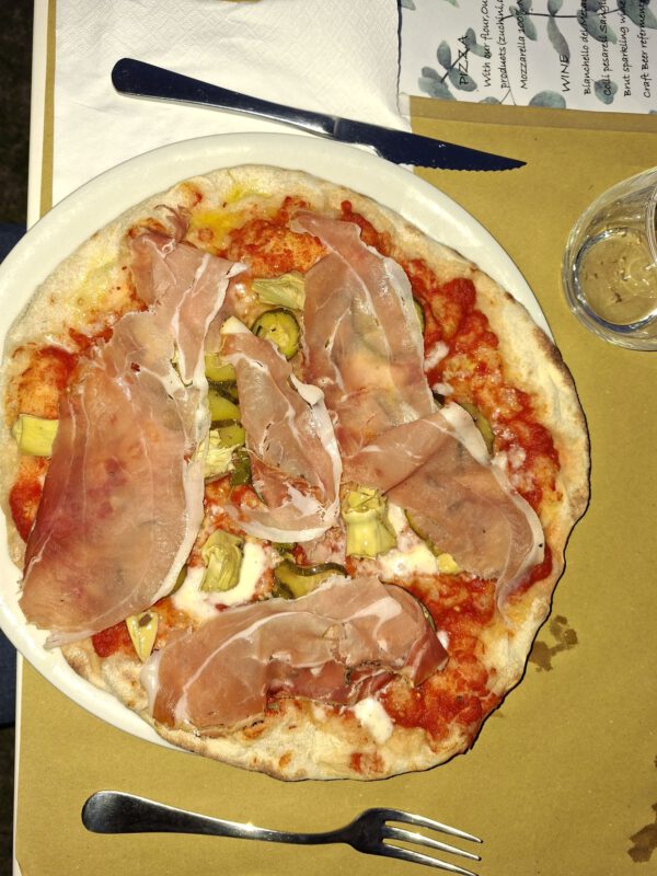 Wir haben selten so gute Pizza gegessen. Auch der Wein ist gut. So lassen wir den Abend gemütlich ausklingen morgen gehts auf die Fähre.