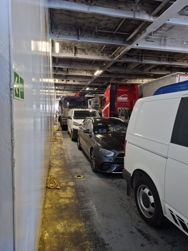 In Bologna war heute Nacht die Autobahn gesperrt und es fehlen daher noch einige PKW und vor allem LKW die nach Patras wollen. Da das Schiff aber zuerst in Igoumenitsa hält müssen die Patras Fahrer zuerst ins Schiff.